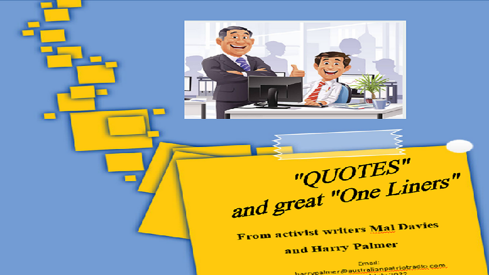 In the year 2000 when the internet was cutting it’s teeth Australian activist, forensic investigator, computer scientist and engineer, Mal Davies started the “ Ïn Your Face”website SOS-NEWS offering an internet presence of the Victorian & NSW governments removing farmers grazing stock and lack of bushfire hazard reduction in National Parks. SOS-NEWS pioneered activist websites targeting government who had no idea how to handle the barrage of information they did not want you the people to know. Harry Palmer took over as editor with back room support from Mal Davies.right up to the last publication in 2015. Harry joined the Cairns News team, today, one of Australia’s most successful online independent factual new services with tremendous international recognition. This e-book is a treasure trove of “Quotes and One Liners”. Started in 2000 by Mal Davies it remains the writers bible of Harry and Mal . Many original, some discovered gems, this e-book is invaluable when writing or compiling a letter requiring the cutting edge. The publication is not catalogued or divided into groups, it’s as we use it daily. Enjoy Harry Palmer harrypalmer@australianpatriotradio.com